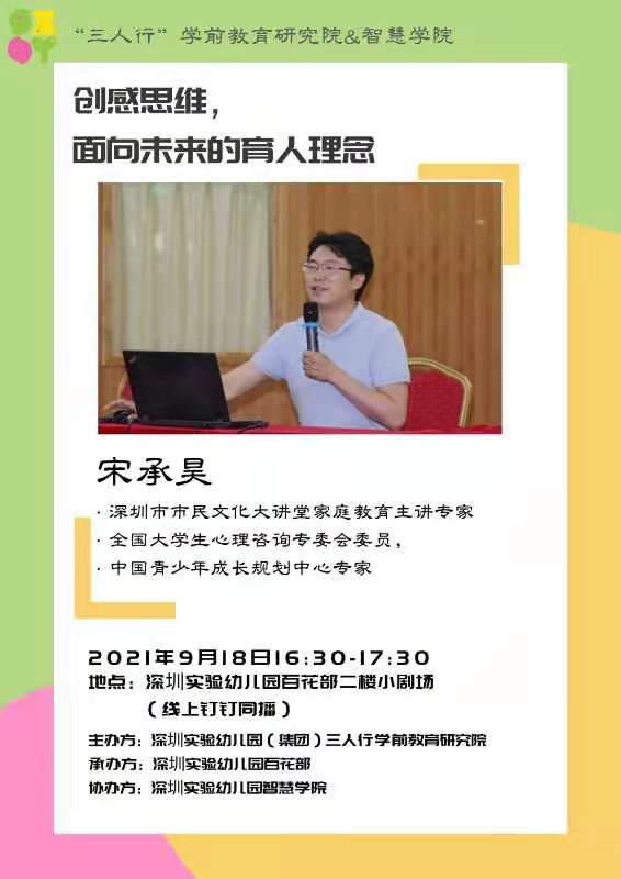 一场主题为“创感思维,面向未来的育人理念”的培训活动由深圳实验幼儿园(集团)三人行学前教育研究院主办,作为深圳实验幼儿园的结对姐妹园,温江区海科幼儿园的全体教师及家长代表很荣幸地收到了培训邀请。为大家开展培训的是深圳市市民文化大讲堂家庭教育主讲专家宋承昊老师,他同时也是深圳城市学院课程与评价改革研究院院长,国内亲子沟通第一畅销书《妈妈,请这样对我说》的作者。四点三十分,这场跨距离的学习,在钉钉线上直播中正式拉开帷幕。